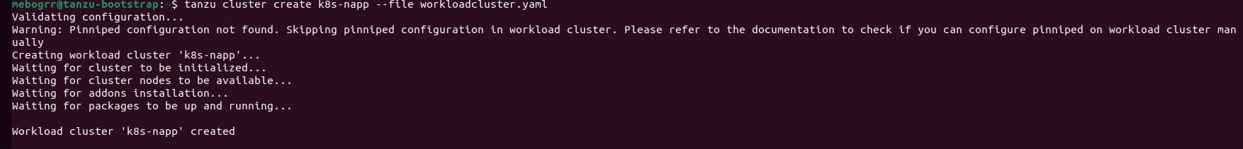 The cluster, user, and context for the Workload cluster are now inserted in our kubeconfig file, and we are even provided the kubectl command (‘kubectl config use-context k8s-napp-admin@k8s-napp‘) to switch over to this particular context. As an aside, you can see all of the contexts that exist in your kubeconfig file with the command ‘kubectl config get-contexts‘ and your current context via ‘kubectl config current-context‘.
