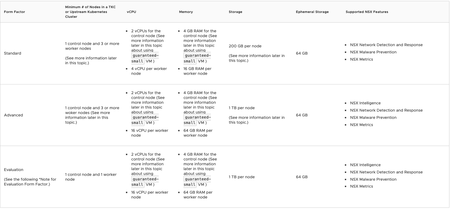 So, for your production environment, the sizing for your worker nodes is functionally dictated by deciding if NSX Intelligence is a requirement. If you are using NSX Intelligence, worker nodes must match the requirements in the ‘Advanced‘ form factor. If you are not using NSX Intelligence, then the worker nodes should match the data listed under ‘Standard‘. As an aside, unless you’re truly doing an evaluation, we’d recommend ignoring the ‘Evaluation‘ form factor entirely.