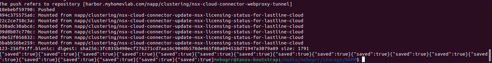 As the script starts, it logs into Harbor, creates a helm repo, and then begins pushing all of the docker containers up to the Harbor repository. After all the docker containers are uploaded, the script concludes by using curl to upload all of the NAPP helm charts; you’ll see the result of the curl actions by a list of ‘{“saved”:true}‘ entries before the script completes and you’re returned to your prompt. Here’s an example of how this appears: