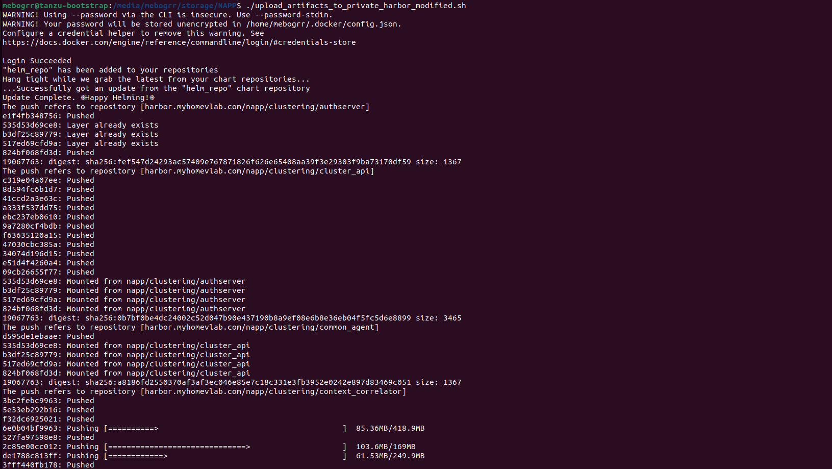Inside the root directory where all of your NAPP files now exist, you’ll need to edit a file named ‘upload_artifacts_to_private_harbor.sh‘. This is a script provided by VMware to make moving the NAPP files to your Harbor registry as painless as possible . The first three lines of the script must be populated with the proper data, which are: