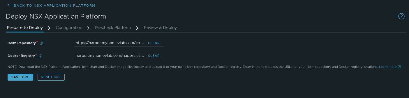 - Docker Registry – This is the URL that the docker instances in your workload domain will utilize to pull down the NAPP components, and is in the format <harbor fqdn>/<harbor project name>/clustering. In our lab this entry is harbor.myhomevlab.com/napp/clustering.