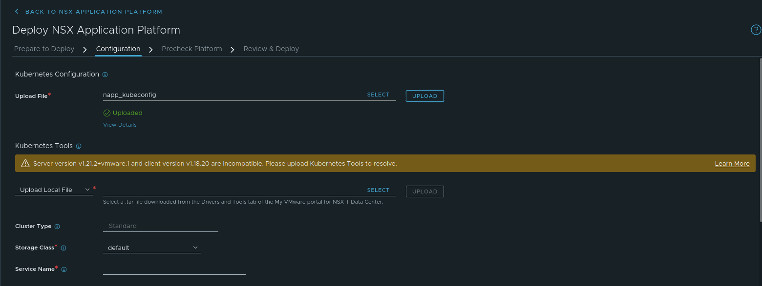In the above, we’ve successfully uploaded our kubeconfig file; the NSX-T manager has parsed the data within and has successfully communicated with the control plane of our TCE Workload cluster. However, we now have a problem, shown in yellow. The message within states “Server version v1.21.2+vmware.1 and client version v1.18.20 are incompatible. Please upload Kubernetes Tools to resolve.”