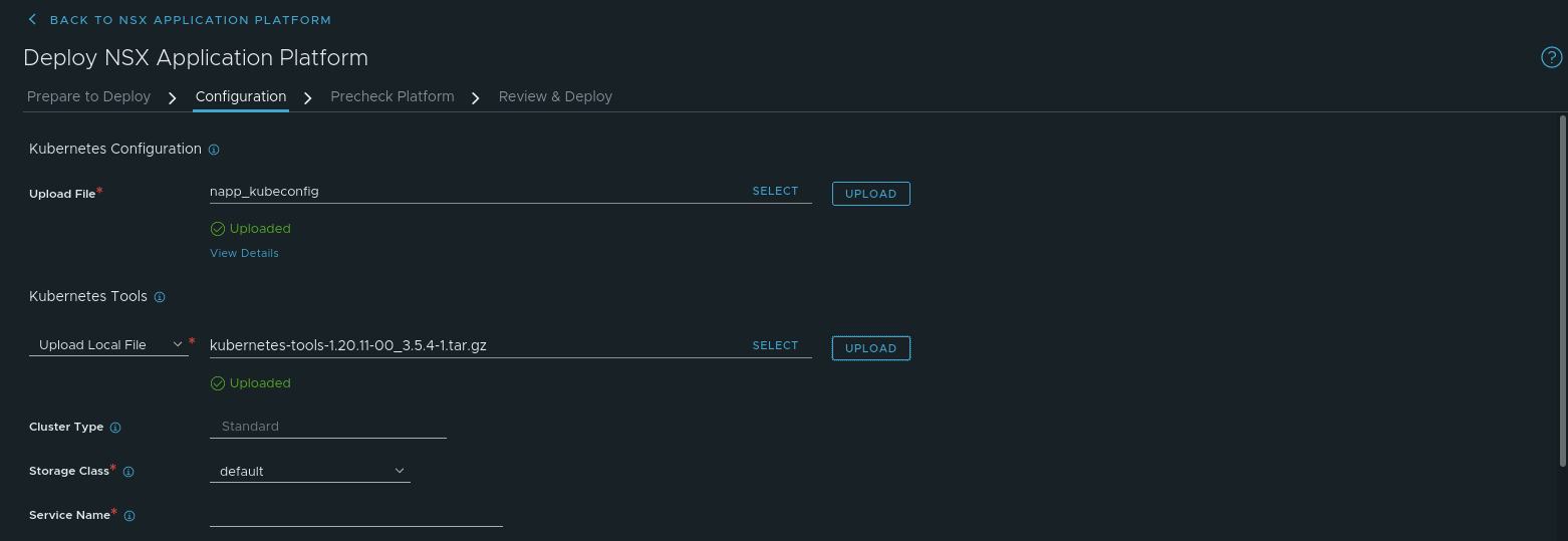 Back in the Configuration screen of NAPP, under ‘Kubernetes Tools’, the drop down should state ‘Upload Local File‘; leave it at this setting. Now you’ll hit the ‘Select‘ Button, and choose the ‘kubernetes-tools-1.20.11-00_3.5.4-1.tar.gz‘ file, then select ‘Upload‘. The bundle will be uploaded to the NSX-T manager and verified.