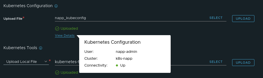 You can see in the above screen where we’ve successfully uploaded our K8s toolkit. As an aside, you can move your mouse over the ‘View Details’ above the ‘Kubernetes Tools‘ section, and you will see that the NSX-T manager displays your K8s cluster name, the user for that cluster, and the connectivity between the NSX-T manager and the control plane components of the K8s cluster. You can see an example of this in the screenshot below.