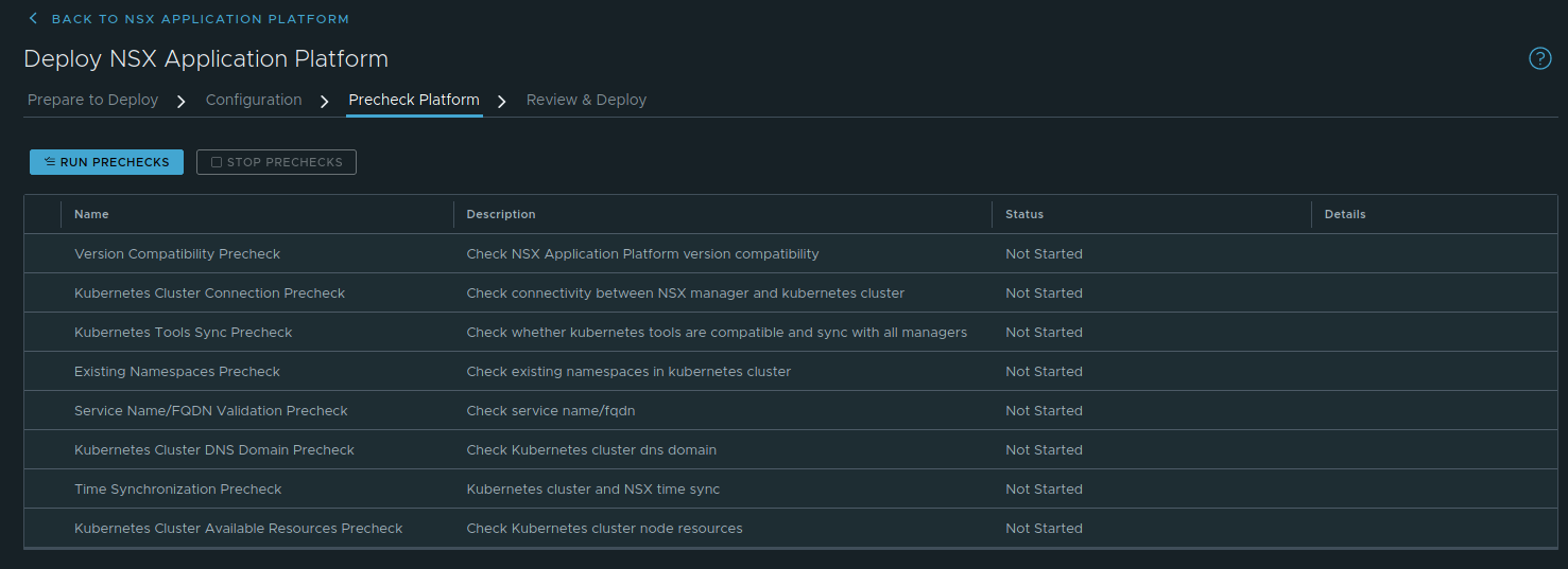 Step 3 is simply a series of prechecks that NSX-T will run to ensure that everything is in order for your NAPP deployment. Just click the ‘Run Prechecks‘ button to start the tests. Below you can see the results of our completed test: