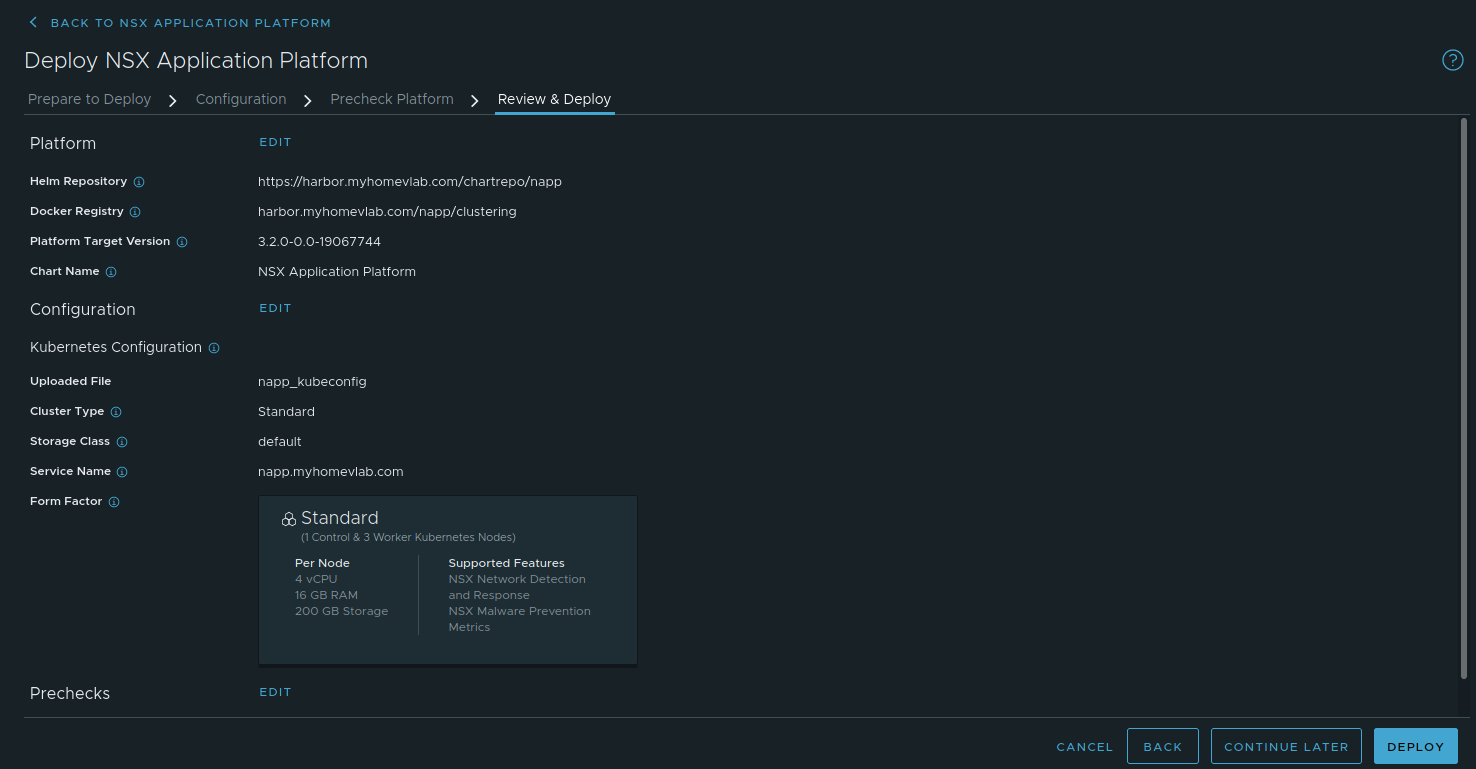 Lastly, at the bottom of the page, we have to choose the ‘Form Factor‘ for NAPP, which just means that we are making sure that our NAPP deployment corresponds to the sizing of our TCE Workload Nodes. As we stated back in part two, our deployment will be using the ‘Standard‘ Form Factor, as our existing lab does not meet the requirements for the ‘NSX Intelligence‘ feature of NAPP.