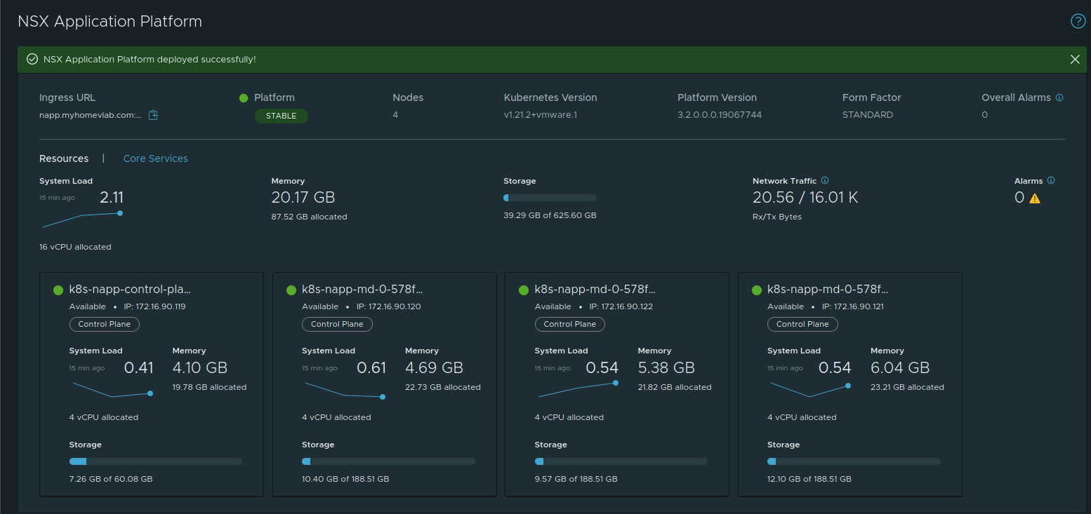 Admittedly, this isn’t a blindingly fast process, so sit back for a while and allow NSX-T to deploy the NAPP components to your TCE Workload Cluster. However… after a little while….