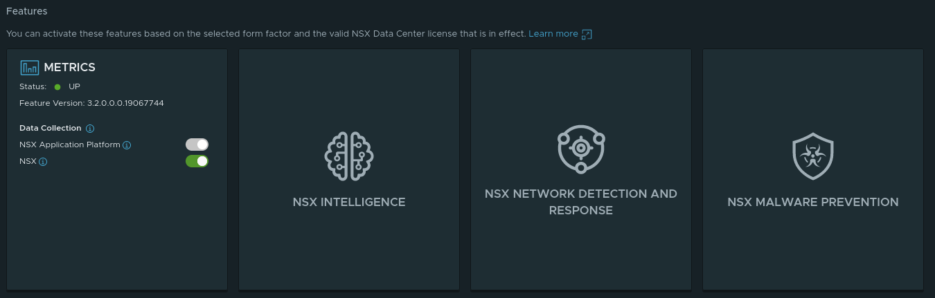 The Metrics feature is enabled by default; no extra action is required. The remaining features are dependent upon 1)- Proper Form Factor (this is applicable to the ‘NSX Intelligence‘ Feature) and 2)- Licensing, which both ‘NSX Network Detection and Response‘ and ‘NSX Malware Prevention‘ require additional licensing to enable.