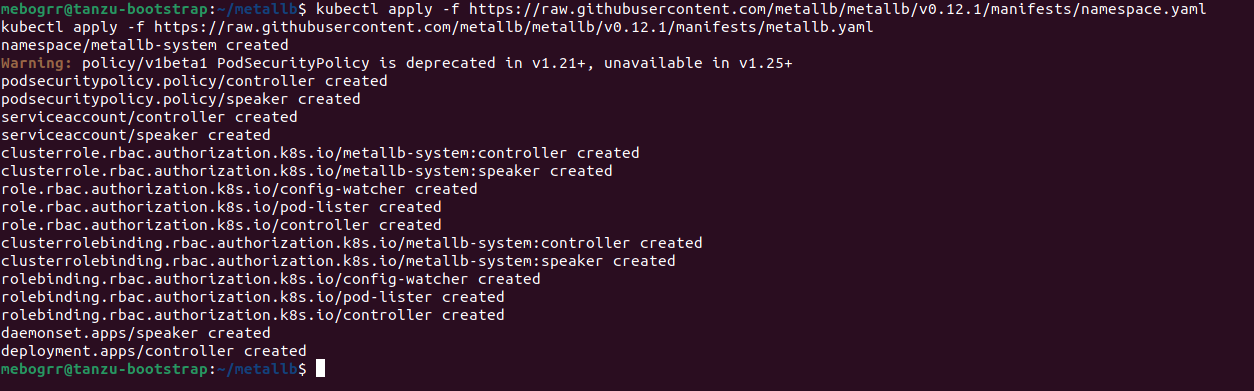 Now that we are in the TCE Workload cluster context, we’ll install MetalLB using the ‘Installation By Manifest‘ method as detailed on the MetalLB site. It only requires two commands, which are: