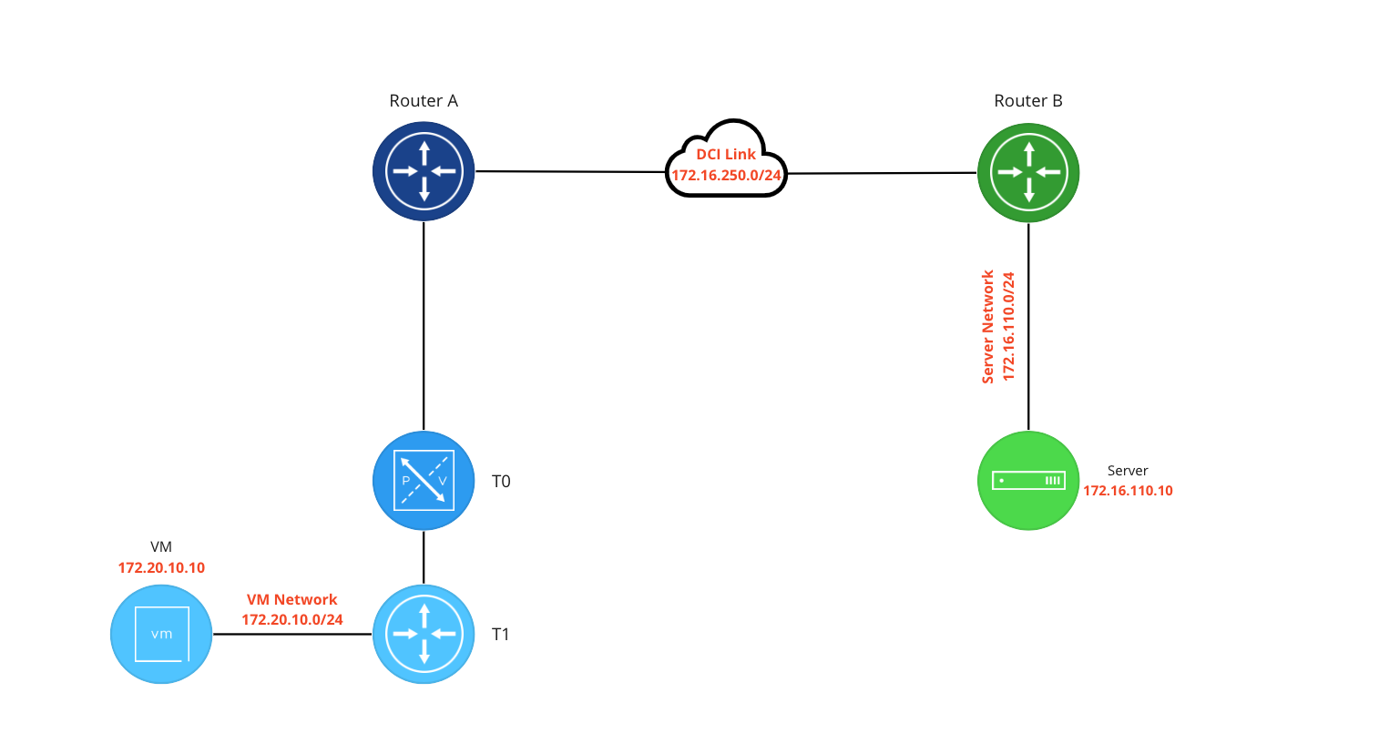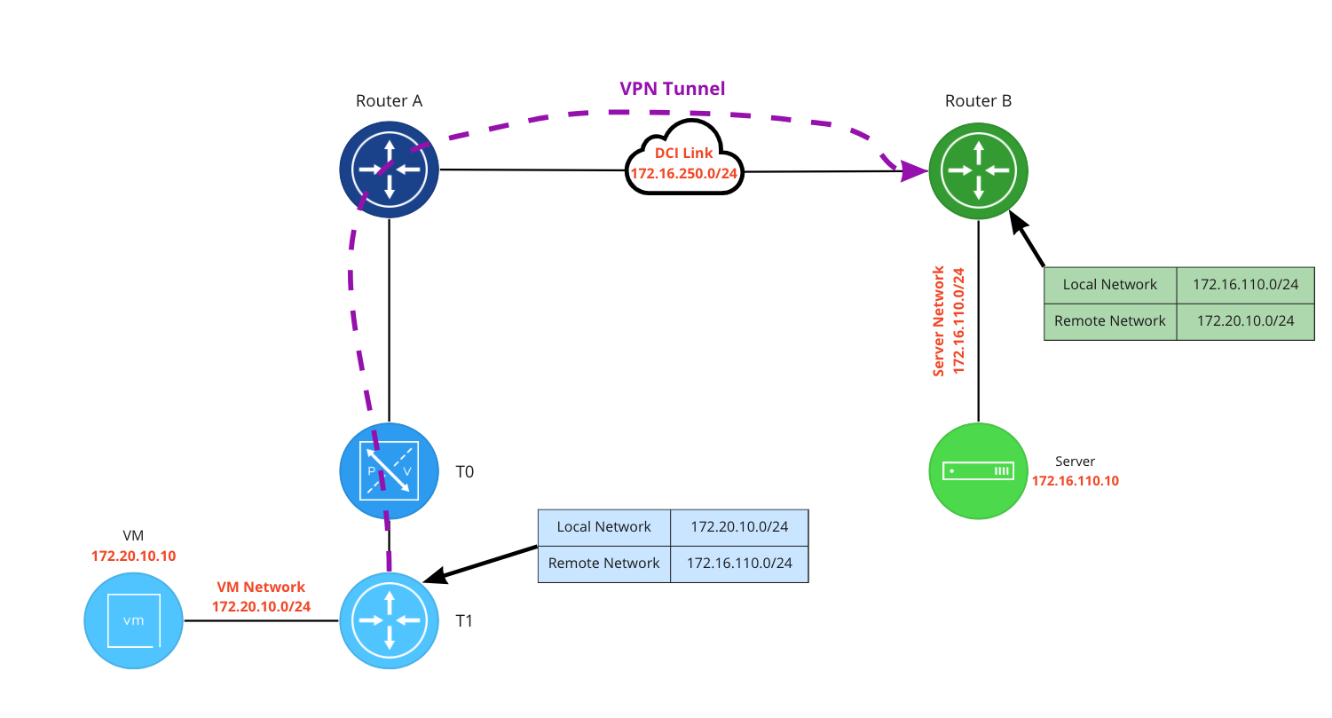 In the above, we have two environments (“blue” and “green”) separated by a data center interconnect (DCI). The blue network provides connectivity to a VM via NSX-T and the green network provides connectivity to a bare metal server via a router. While we could easily route between the VM network and Server network, our InfoSec group has a requirement that traffic traversing the DCI must be encrypted.