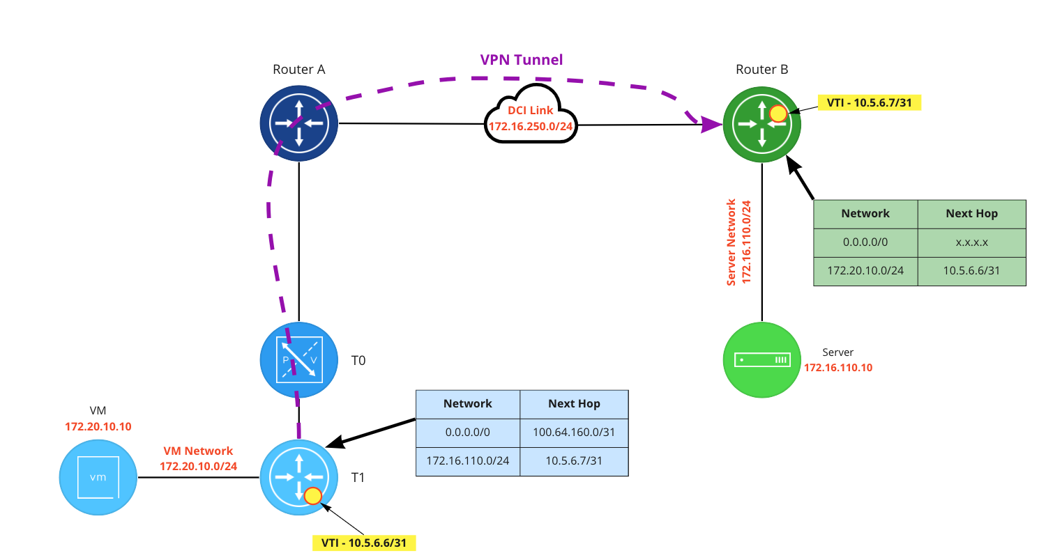 When the VM at 172.20.10.10 communicates with 172.16.110.10, the traffic is first received by a T1 DR (not depicted) and then routed to the T1 SR. Unlike a Policy Based VPN, this traffic is not evaluated for a source/destination match; instead, the blue T1 SR has a static route for 172.16.100.0/24 with a next hop of the green router’s VTI address (10.5.6.7/31). As the blue T1’s VTI is on this same subnet (10.5.6.6/31, depicted in yellow on the blue T1), it is utilized to reach the next hop. The result of this routing action via the VTI is the traffic is encrypted and sent to the peer VPN device (Router B).