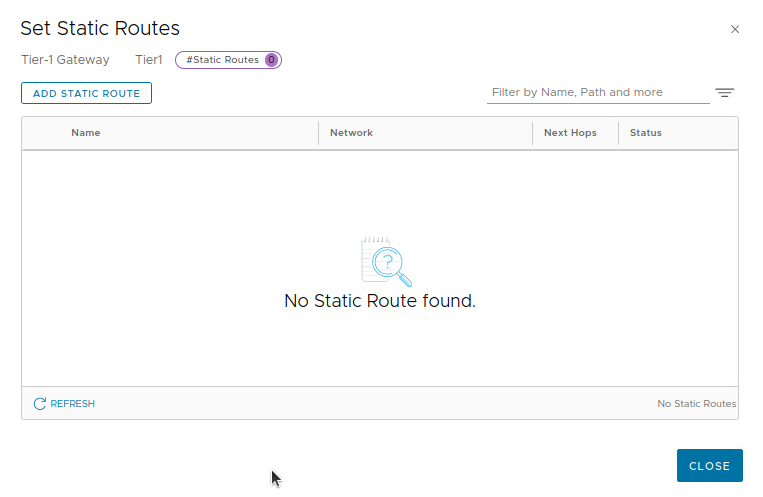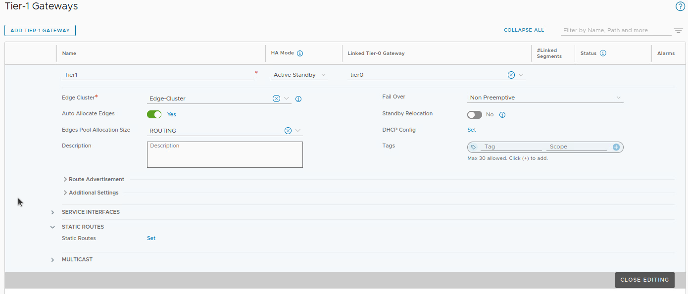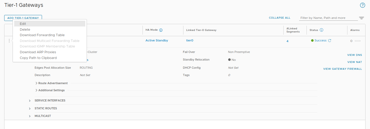 To successfully utilize our Route Based VPN, we need to ensure that traffic to our target destination is routed via our new VTI. As we are terminating the VPN on a T1 SR, we must utilize a static route to forward this traffic (click here for our previous discussion on this topic). To create this static route, in ‘Networking -> Tier-1 Gateways‘, click the 3 dots to the left of our T1 and select ‘Edit‘.