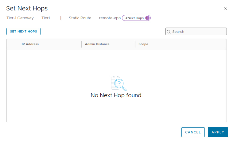 First, we enter a name for our static route (‘remote-vpn‘ below), and the CIDR notation for the destination. In our lab environment, this is ‘172.16.110.0/24‘. Once this data is entered, click the ‘Set‘ link in the ‘Next Hops‘ column.