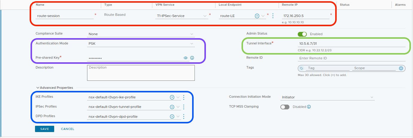 In the red circle, enter a name for the IPSec Session (‘route-session‘) and then select the previously created VPN Service (‘T1-IPSec-Service‘) and Local Endpoint (‘route-LE‘) from drop down lists. After this, populate the ‘Remote IP‘ field with the IP address of the remote device that will be terminating our VPN (‘172.16.250.5‘).