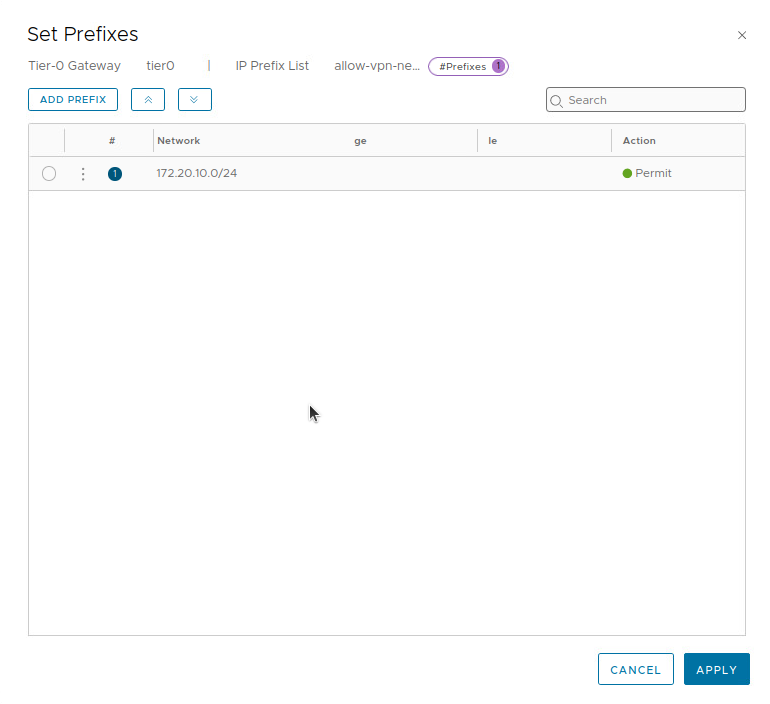 To control the networks advertised to our remote peer, we’ll create an IP prefix list that only allows our desired network (‘172.20.10.0/24‘). Expand the ‘Routing‘ section of our T0, and click the number beside ‘IP Prefix Lists‘.