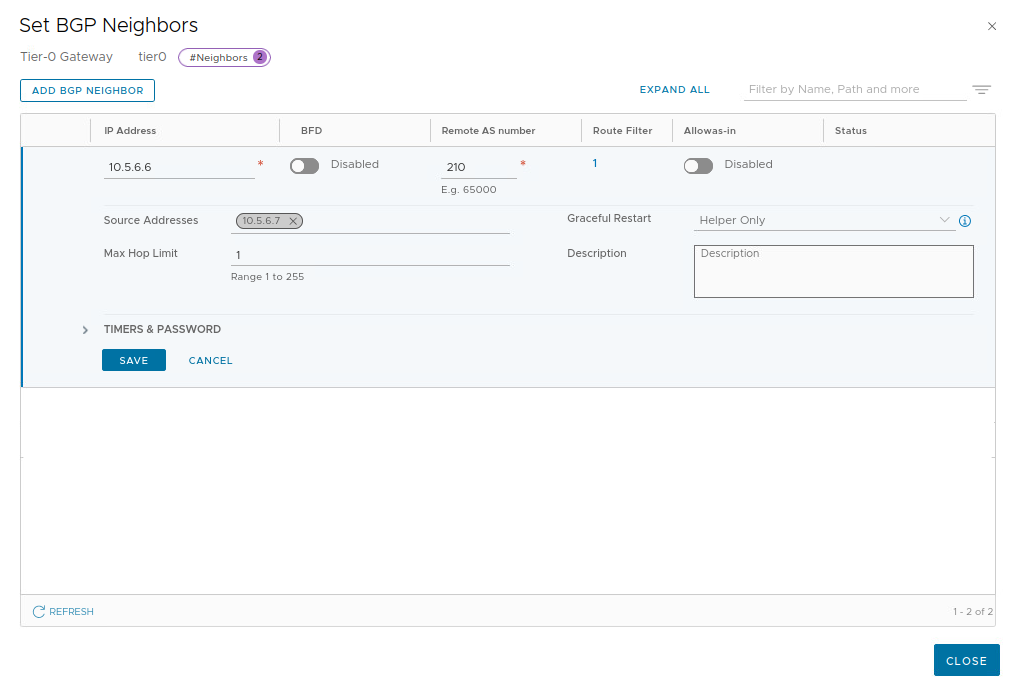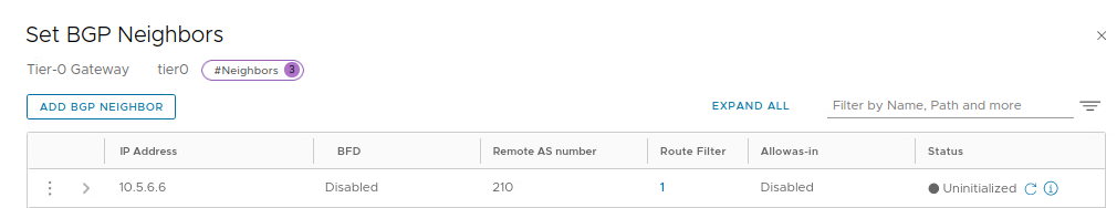 Returning to the T0 configuration screen, we can now configure the VTI on our remote VPN peer as a BGP neighbor. Expand the ‘BGP‘ section in the T0, and click on the number beside ‘BGP Neighbors‘.