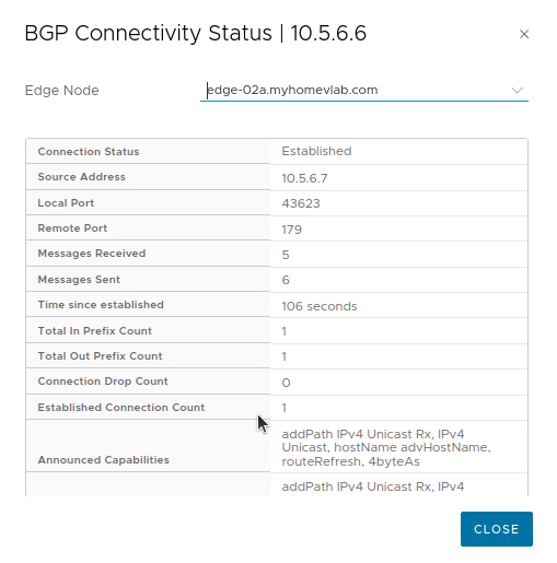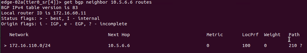Additional information can be found directly on the T0 SR by connecting to the Edge Node that hosts the active T0 SR. Demonstrated below is a listing of the routes learned from the remote peer: