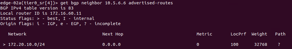 As you can see, only ‘172.16.110.0/24‘ is being learned by our T0 SR, as this is the only network that ‘Router B‘ is advertising. We can also look at the routes being advertised to the remote peer in much the same way: