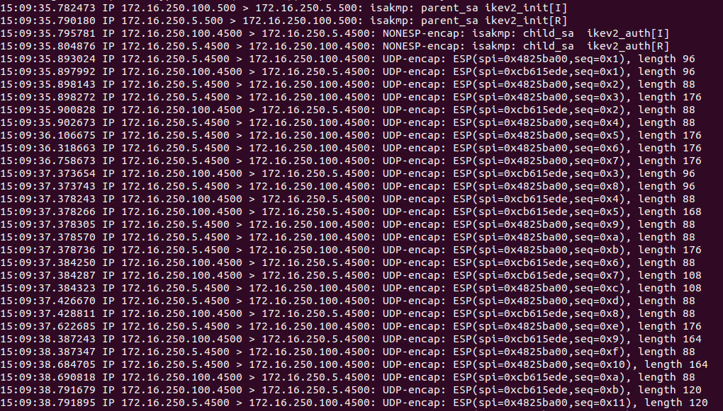 Lines 1 and 2 show our IKE negotiations beginning using UDP 500, but then we change over to UDP 4500 at line 3, where the IPSec child Security Associations (child-SA)s are being created. Once tunnel negotiation is completed, all ESP traffic is then encapsulated in a UDP port 4500 packet; you may observe this in the above beginning at line 5.