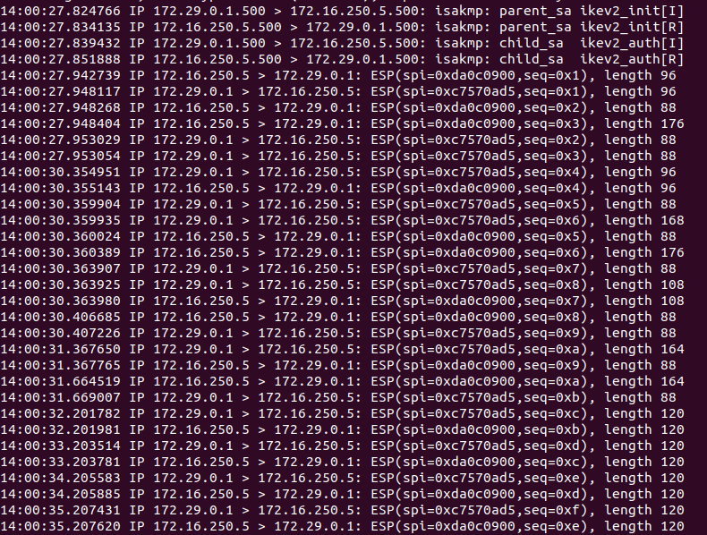 In the first four lines, you can see the VPN tunnel negotiation occurring. Internet Key Exchange (‘IKE‘) communications occur over UDP port 500, and these communications occur between our two local endpoint IP addresses. After tunnel negotiation completes (beginning with line 5), bi-directional encrypted traffic is observed; this is the ICMP echo request and echo reply between the “blue” VM and “green” sever utilizing the VPN tunnel.