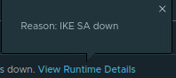 If we click on the “I” symbol beside the word ‘Down‘ under ‘Status‘, we can see that the ‘IKE SA‘ is down, and we also see an ‘Authentication failed‘ message under ‘IKE Status‘ at the bottom.