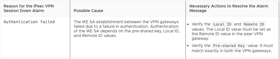 For the ‘Authentication Failed‘ message, we can reference the NSX 4.0 Administration guide for IPSec VPN alarms, along with their possible causes and suggested actions to resolve the issue. Below is a capture of the data from this page regarding ‘Authentication Failed‘.