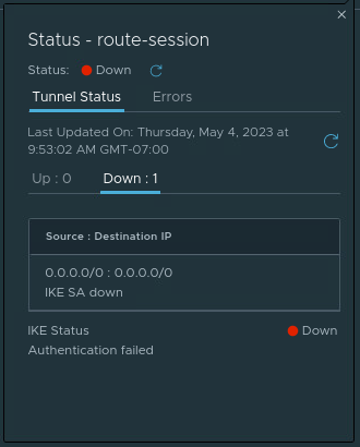 For each alarm, we can click ‘View Runtime Details‘ in the ‘Description‘ field to gather additional information. The ‘IPSec Route Based Tunnel Down‘ alarm (below on the left) notes that the tunnel is down with the reason of ‘IKE SA down‘. When we check the ‘IPSec Route Based Session Down‘ alarm (below on the right), we find the reason of ‘Authentication failed‘.