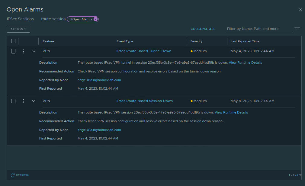 We can also click on the number listed under ‘Alarms‘ (beside the ‘Status‘ column) and get a list of the open alarms for this VPN session. In our lab, we have two alarms listed – ‘IPSec Route Based Tunnel Down‘ and ‘IPSec Route Based Session Down‘. Each of these alarms give a brief description as well as a recommended action.