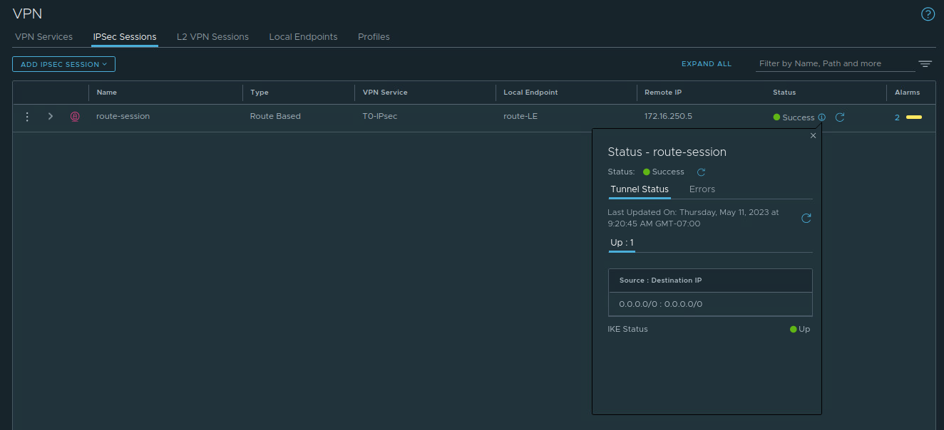 Now, we can return to the ‘IPSec Sessions‘ section of NSX, and we can see our IPSec Session has come up successfully.