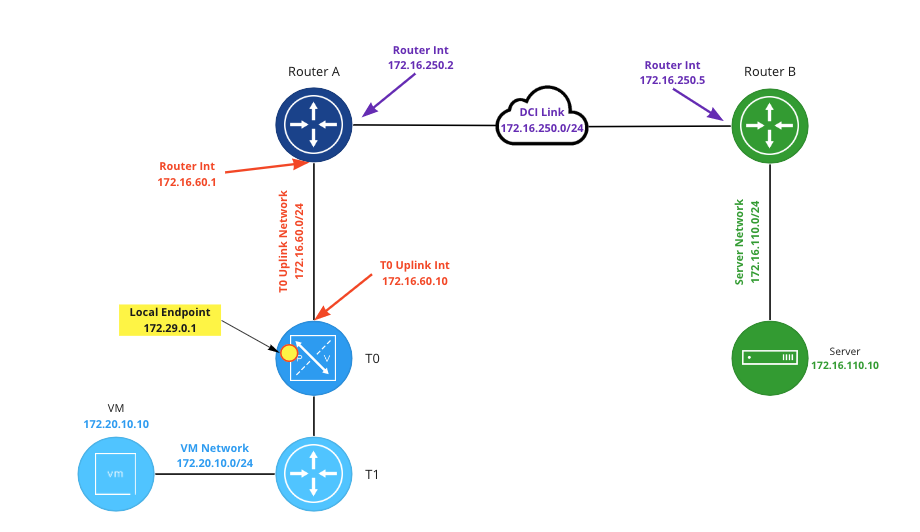 In the above image, the local endpoint in NSX (which resides on a Tier-0 (‘T0‘) Service Router (‘SR‘) ) is configured as ‘172.29.0.1‘, while ‘Router B‘ has a local endpoint matching it’s interface address on the ‘DCI Link‘ (‘172.16.250.5)’. In this example, it’s important to know that each local endpoint can natively be reached by its peer device. That is, the T0 SR can route to ‘172.16.250.5‘, and ‘Router B‘ has a route to ‘172.29.0.1‘.