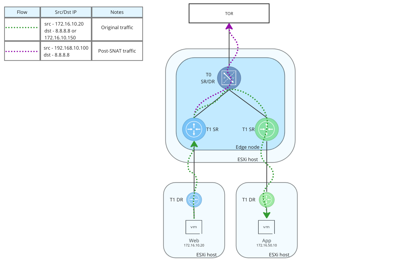 The T1 SR has a SNAT rule configured for this traffic, so the source IP address of the flow is changed to ‘192.168.10.100‘ and the traffic is sent out of the T1 SR’s uplink interface to the T0 (as depicted by the purple dotted line), where it then egresses NSX. As SNAT rules in NSX are stateful, reply traffic will be “un-SNAT’d” by the T1 SR before being returned to the ‘Web‘ VM.