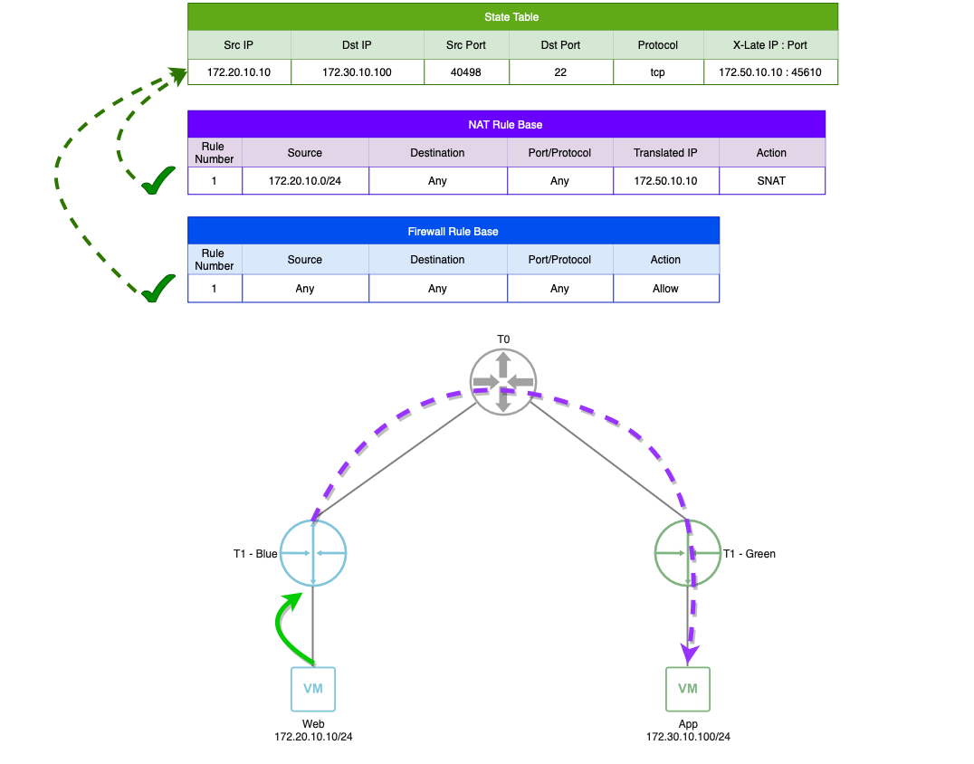 In this final diagram, the purple dashed line represents the reply traffic from the ‘App‘ VM back to the SNAT address (‘172.50.10.10‘) used by the ‘T1 Blue‘ SR. Once this packet is received, as it matches an entry in the state table, it is not compared to the NAT or firewall rule base. Additionally, as the matching state table entry has a NAT action included, the packet is “un-SNAT’d” and the destination is changed back to the ‘Web‘ VM’s original IP address of ‘172.20.10.10‘. The packet is then routed to the ‘Web‘ VM.