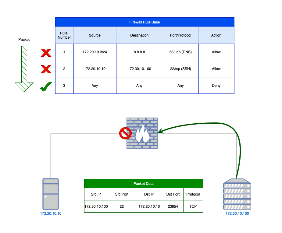 In the above, a packet destined for 172.30.10.100 (to port 22/TCP) from 172.20.10.10 is compared against our rule base, starting with rule 1. As the packet does not match the data in rule 1, it is then compared to rule 2 where it successfully matches. This match results in the ‘Allow‘ action being taken on the packet, and it continues on to 172.30.10.100.