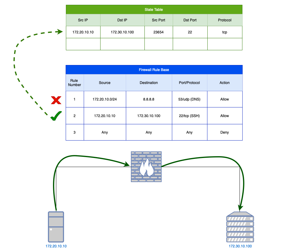 Here we see 172.20.10.10 is sending a packet to 172.30.10.100 on port 22/TCP, and it’s received by a stateful firewall. The packet is first compared to the state table, where no match exists, as this is the beginning of a new communication. The packet is then compared against the firewall rule base, where a rule to allow this traffic (rule 2) matches. The packet is now sent onward to its destination, and a state table entry is created for this flow.