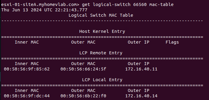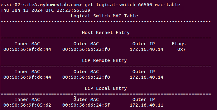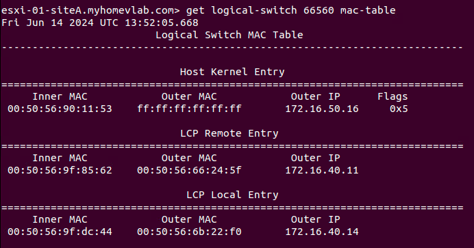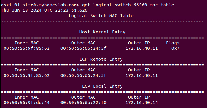 Note: For the ‘Web03‘ entry under ‘Host Kernel Entry‘ in both of the above examples, the ‘Outer Mac‘ field is ‘ff:ff:ff:ff:ff:ff‘; this is because the TEPs for our ESXi hosts are in the ‘172.16.40.0/24‘ subnet, while the Edge TEP is using an IP from the ‘172.16.50.0/24’ subnet. This means that traffic from Host TEPs to Edge TEPs in our lab must be routed. If we had configured our Host TEPs and Edge TEPs to be in the same subnet (which requires additional configuration considerations), then you’d see the actual MAC address of the Edge Node TEP listed under ‘Outer MAC‘.