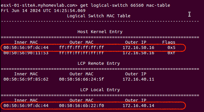 Hmm… so this appears unusual. We still see the MAC address for ‘Web01‘ in the ‘LCP Local Entry‘ as expected. However, there’s also an entry for the MAC address of ‘Web01‘ in ‘Host Kernel Entry‘ table and its ‘Outer IP‘ field is using the IP address of the Edge Node TEP.