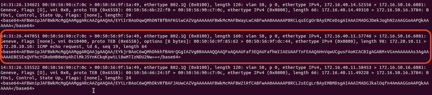 The above was captured on the Edge Node’s TEP interface. While there’s a lot of extraneous traffic that runs to and from the TEP, let’s look at the circled data. You can see that the Geneve header itself is sourced from ‘172.16.40.11‘ (‘Host02‘s TEP) and is destined for the Edge VM’s TEP (‘172.16.50.16‘). If you look a bit deeper in the frame, you can see the inner header, with a source of ‘172.20.10.11‘ (‘Web02‘) and a destination of ‘172.20.10.10‘ (‘Web01‘). You can even see this is an ICMP echo request.