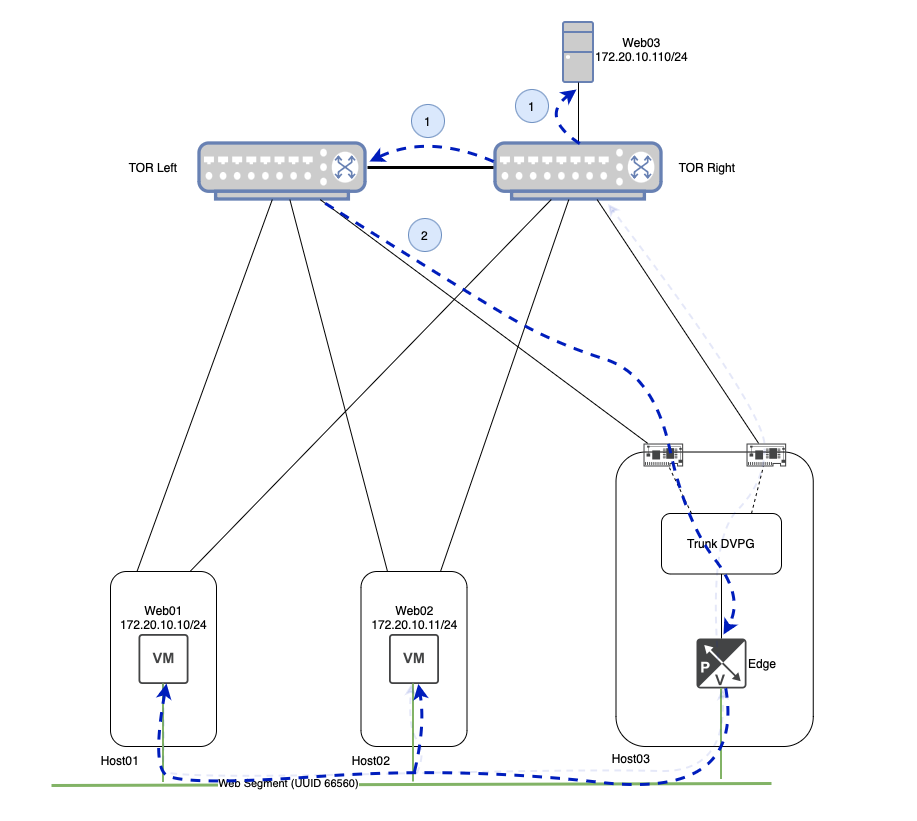 - ESXi ‘Host03‘ is where the NSX Edge VM that is providing bridging resides.