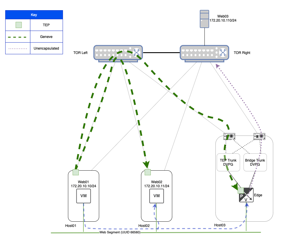 In the above, we can see that ‘Web01‘ is communicating to a VLAN backed network via an NSX bridge. This is made possible by ‘Host01‘ encapsulating ‘Web01‘s traffic in Geneve and sending it via its own TEP to a TEP on the bridging NSX Edge VM.