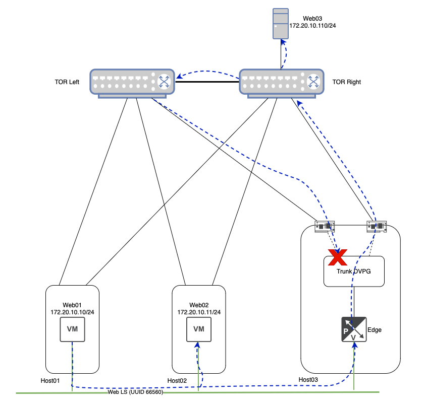 The above image shows the broadcast ARP frame being sent from ‘TOR Right‘ to ‘TOR Left‘ (as well as being delivered to ‘Web03‘), and then back to ‘Host03‘, just as described in the ‘Broadcast Traffic and Bridging‘ section. Since the ‘Bridge Trunk‘ DVPG has ‘Promiscuous Mode‘ configured to ‘Accept‘, the frame is delivered to the connected interface of the Edge VM.